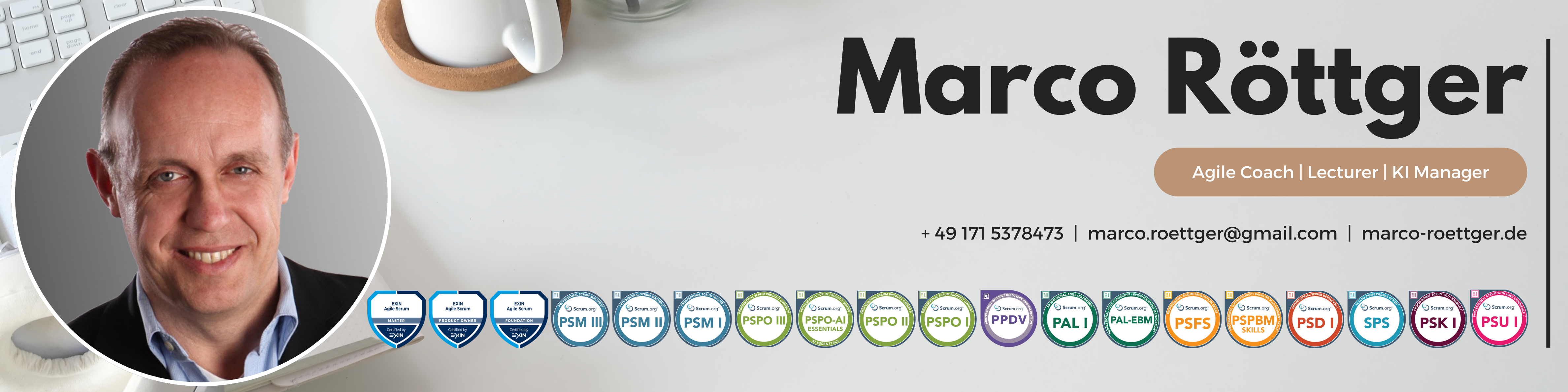 Seit über sechs Jahren bin ich als Agile Coach, Scrum-Trainer und Online-Lehrbeauftragter tätig und habe eine Leidenschaft dafür entwickelt, Menschen und Unternehmen dabei zu unterstützen, sich in unserer komplexen und oft chaotischen Arbeitswelt zurechtzufinden.